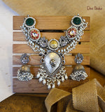 Oxidised Silver-plated metal, Green gemstone paired with Vilandi stones and white beads, Antique silver finish.