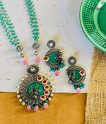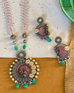 Get ready to add some serious sparkle to your necklace collection! This piece features oxidized silver-plated metal, a vibrant stone, and vilandi stones, all perfectly paired with colorful beads.