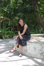 A-line Kalidaar midi dress in black Kala Cotton weave.Features a boat neck and sleeveless silhouette for effortless elegance. Model is 5'4" and wearing size XS.
