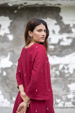 A-line Kala Cotton kurta in a rich maroon weave, featuring a soft V-neck, 3/4 sleeves, and a flared, comfort fit.