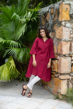 A-line Kala Cotton kurta in a rich maroon weave, featuring a soft V-neck, 3/4 sleeves, and a flared, comfort fit.Designed with a slight asymmetrical hem for fluid movement and ease. For the perfect fit with...
